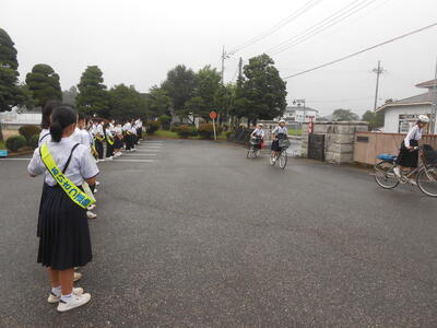 【一斉下校】毎週水曜日は「一斉下校」の日です。校門から全員が下校します。自転車通学者は間隔を取りながら1列で左側を下校するようにしていますが、車の通りが少ないところでは並進しているようです。いつでも、どこでも1列で安全に気をつけて登下校してほしいです。下校の様子をご覧ください。