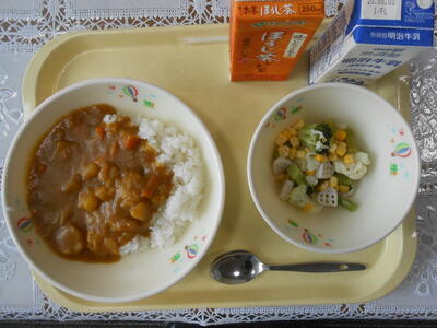 【給食メニュー】誰もが食べられる(アレルギー食材削除)メニューの「ハートカレー」です。牛乳が飲めない生徒にはほうじ茶が出ました。今日で夏休み前、最後の給食です。