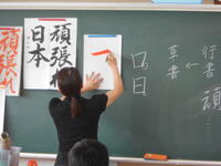 2年2組「国語」書道での筆の使い方について学んでいました。