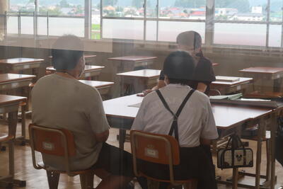 【三者面談の様子】廊下から窓越しのため撮影のため見えづらいので御了解ください。