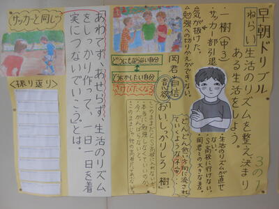 【校内散策】3年生の道徳の授業での振り返りシートが掲示されていました。部活動が終了し、いざ受験といってもなかなか取り組めない主人公について考えていました。授業を通して「生活のリズムを整えることの重要性」を学んだようです。実践してほしいですね。