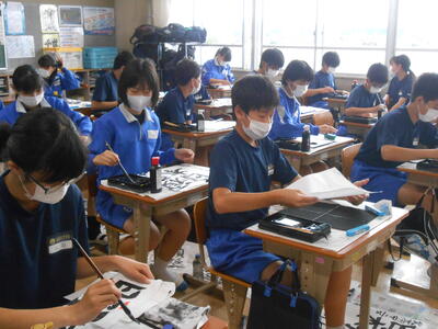 2年1組「国語」筆を使い、実際に用紙に墨で書いていました。姿勢も大切ですね。