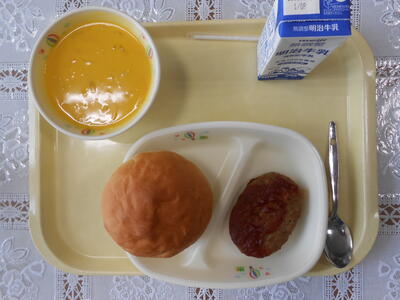 【給食メニュー】カボチャのポタージュ、ハンバーグ、丸パンです。パンに挟んでハンバーグを食べました。久しぶりの給食でとても美味しかったです。