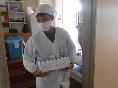 牛乳を1階まで取りに来ています。服装もバッチリです。