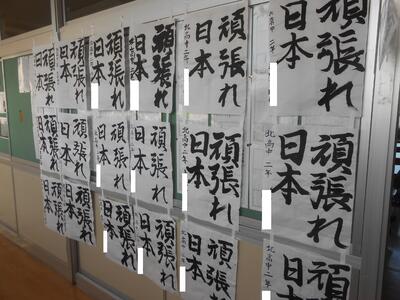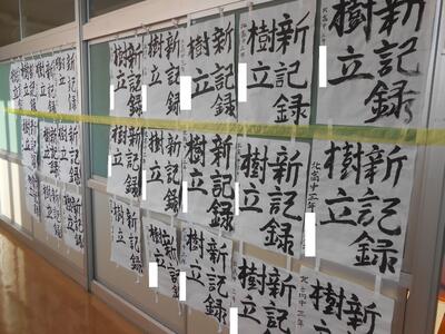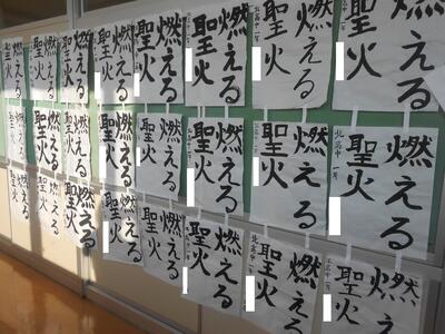 【校内書道展】廊下には夏休み中の課題であった「書道」が掲示されました。今年は「東京オリンピック」が開催される予定であったため、言葉がオリンピックに係わる内容です。後日、審査が行われます。