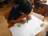 2年1組「美術」「一点透視法」を活用してデザイン画を作製していました。