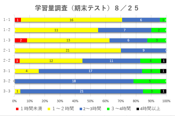 【学習量調査 8/25日】期末テスト5日前になりました。学習委員会で毎日の家庭学習時間を調査しています。さすがに3年生になると平日でも学習量が増えています。計画を立て進んで学習しましょう。