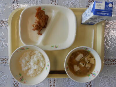 【給食メニュー】鶏の唐揚げのレモンソース和え、キムチスープです。唐揚げがとても柔らかくて味も美味しかったです。
