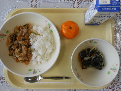 【給食メニュー】ブルコギ風豚丼、ワカメともやしのナルム、冷凍みかんです。昔、駅のホームで買った「冷凍みかん」が思い出されました。