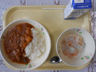 【給食メニュー】夏野菜カレー、フルーツヨーグルトです。カレーで疲れが吹っ飛びます。
