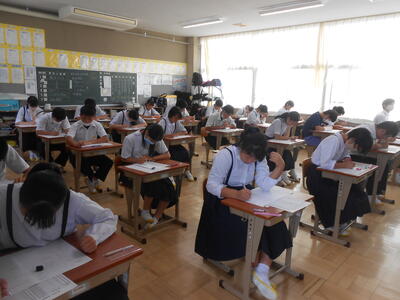 3年1組「実力テスト」3年生は高校入試に向けて、5教科の復習テストを実施しています。1・2年生で学習した内容も出題されるので、日頃の学習の成果が表れます。