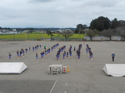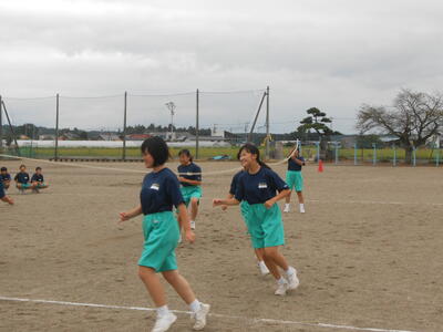 【学年練習(3年)】準備体操の後、団体・個人の種目を行いました。テスト勉強で寝不足の生徒も多かったようですが、若さあふれる走りを見せてくれました。