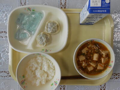 【給食メニュー】マーボー豆腐、てんぐにら饅頭、ゼリーです。マーボー丼にして食べました。美味しかったです。ごちそうさまでした。