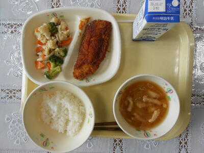 【給食メニュー】ご飯、牛乳、白身魚フライトマトソースがけ、ブロッコリーとしめじのサラダ、大根と油揚げの味噌汁です。白身のフライがとても柔らかく、骨など気にならずとても美味しくいただきました。ありがとうございました。