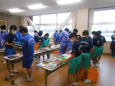 【委員会活動】町の図書館の協力を得て、本を借りてクラスで読んでいます。今日は各クラスの図書委員が「クラス文庫」を開設するため本を選択しています。