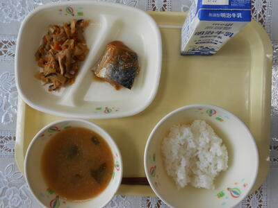 【給食メニュー】セルフ五目ご飯、牛乳、サバ味噌煮、田舎汁です。田舎汁にはなめこ・なす・玉ねぎなどが味噌の味に溶け込みとても美味しかったです。ごちそうさまでした。