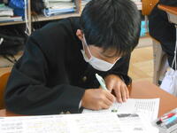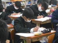 【テストの様子】テスト最終日、残り2教科です。今日は静かに教室内に入り、生徒の回答状況を確認しました。空欄(無回答)が無いようにしっかり文字を書いていたのが印象的でした。わからなかった問題や間違った問題は早めに解決しましょう。