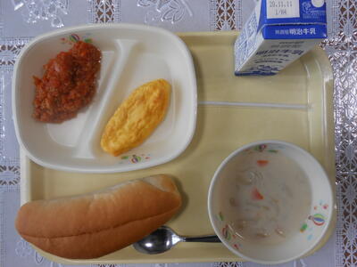 【給食メニュー】コッペパン、牛乳、オムレツ、スラッピージョー、クラムチャウダーです。牛挽肉、タマネギ、トマトソースで作られたスラッピージョーをパンに挟んで食べました。ごちそうさまでした。ちなみに、恥ずかしながらスラッピージョーという料理名を初めて知りました。m(_ _)m