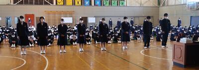 【全校集会】読書感想文や少年の主張、水泳大会、駅伝大会、誇れる町民賞などの授与式を行いました。