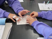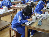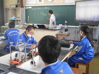 2年2組「技術」ソーラーラジオの作製です。ハンダ小手を使って接続するのが難しいようです。