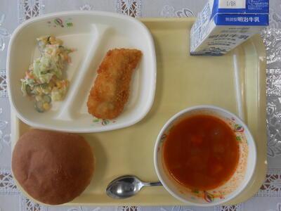 【給食メニュー】丸パン、白身魚フライ、コールスローサラダ、ミネストローネです。パンにフライやサラダを挟んでフィッシュバーガーで美味しくいただきました。ごちそうさまでした。
