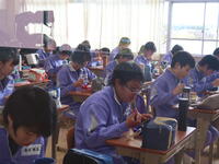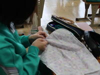 1年1組「家庭」裁縫で、なみ縫いを使ってふきんを作っていました。