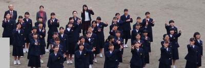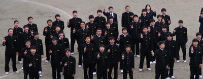 【卒業アルバム撮影】卒業アルバムの集合写真を撮影しました。曇り空で肌寒い中でしたが笑顔で撮れました。