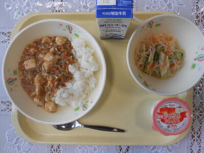 【給食メニュー】わかめご飯、牛乳、鶏肉の唐揚げ、ツナのり酢和え、坦々春雨スープ、シークワーサーゼリーです。毎日違った汁物が献立に出され、とても楽しみです。ごちそうさまでした。