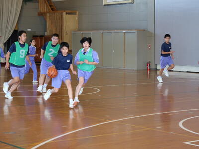 1年男子「保健体育」長距離走では同じペースで長く走ることが大切です。全員でペースを守って走っていました。中学生の時期は心肺機能が著しく発達する時期と言われています。すべてのスポーツにおいて持久力は必要です。