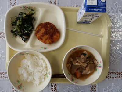 【給食メニュー】ご飯、牛乳、ポーク焼売、ひじきの炒り煮、豚汁です。肌寒い日には豚汁が最高です。ごちそうさまでした。