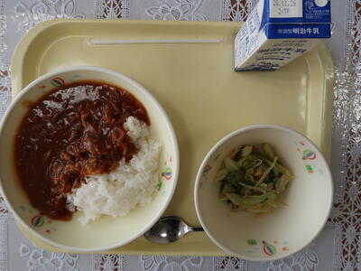 【給食メニュー】ポークカレー、牛乳、ごぼうサラダ、みかんです。カレーは生徒の好物の一つで、甘味がありとても美味しかったです。ごちそうさまでした。