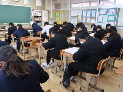 【テストの様子】廊下を歩いていても声が全く聞こえない静かな状況で問題に取り組んでいました。窓越しから撮影しても誰一人として問題から目を離す生徒はいませんでした。素晴らしい集中力です。(窓越しでの撮影のため鮮明ではありません m(_ _)m)