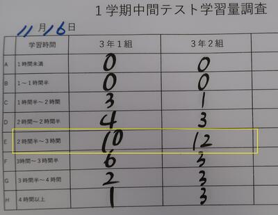 【校内散策】学年が上がるにつれて学習時間が増えています。3年生は3時間程度、2年生は2時間30分程度、1年生は2時間程度が平均です。今日もしっかり学習時間を確保しましょう。