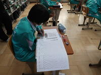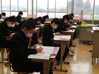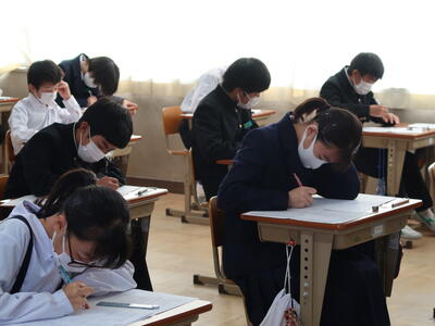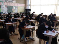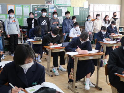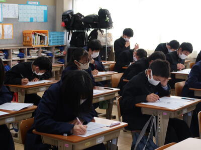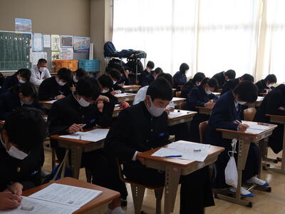 【テストの様子】テスト最終日、残り2教科です。今日は静かに教室内に入り、生徒の回答状況を確認しました。空欄(無回答)が無いようにしっかり文字を書いていたのが印象的でした。わからなかった問題や間違った問題は早めに解決しましょう。