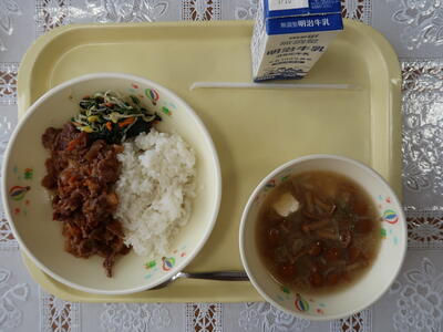 【給食メニュー】牛丼、ほうれん草のナルム、なめこ汁です。牛丼の肉がとても柔らかく、ご飯に染み込んだタレと一緒にあっという間に完食しました。ごちそうさまでした。
