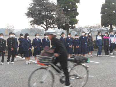 小雨降る肌寒い朝を迎えました。そんな中、生徒は時間を守って安全に登校しています。これからさらに冷え込み、路面も凍結する場合があります。布団から出る時間を少し早め、余裕を持って登校してほしいです。