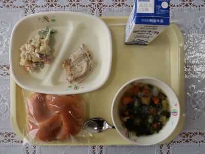 【給食メニュー】米粉パン、牛乳、鶏肉のハーブ焼き、さつまいものサラダ、ポトフです。ポトフには人参、アスパラ、玉ねぎ、大根、豚肉など具だくさんで味がしみ込み、とても美味しかったです。ごちそうさまでした。