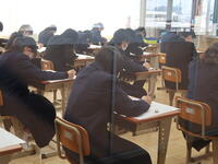 【テストの様子】廊下を歩いていても声が全く聞こえない静かな状況で問題に取り組んでいました。窓越しから撮影しても誰一人として問題から目を離す生徒はいませんでした。素晴らしい集中力です。(窓越しでの撮影のため鮮明ではありません m(_ _)m)