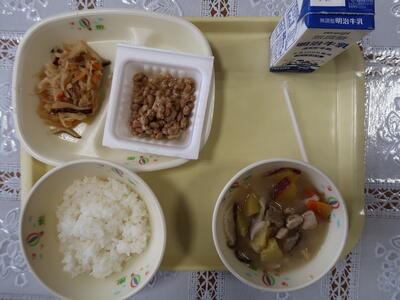 【給食メニュー】ご飯、牛乳、納豆(栃木県産)切り干し大根の煮物、豆乳仕立ての野菜汁です。野菜汁には旬のさつまいもや椎茸などがたくさん入っていてとても美味しかったです。ごちそうさまでした。