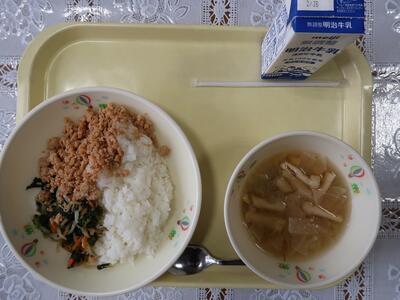 【給食メニュー】そぼろ丼、牛乳、大根と油揚げの味噌汁です。大根がとても柔らかく、味も染み込んでいてとても美味しかったです。ごちそうさまでした。