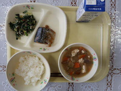 【給食メニュー】ご飯、牛乳、サバの味噌煮、じゃことエビのサラダ、きのこけんちん汁です。サバの味噌煮はとても柔らかく、タレもすごく美味しくいただきました。ごちそうさまでした。