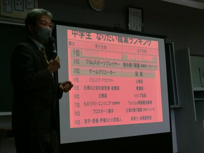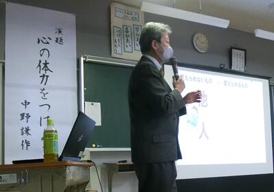 【キャリア教育講演会】2年生対象に「心の体力をつけよう」というテーマで講話をいただきました。将来の希望を実現するために、今の時代に行わなければいけないことをお話しいただきました。