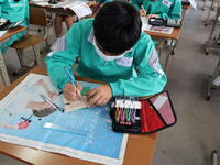 3年3組「美術」デザイン画の彩色です。そろそろ仕上げの段階です。