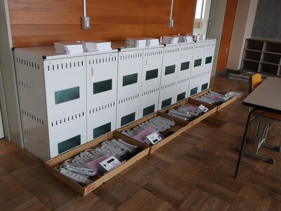 【答え】 現在、高根沢町では生徒1人1台タブレットを設置し、授業で活用できるようにしています。このボックスはタブレットを収納するボックスです。ここに入れて充電し、持ち出して活用する予定です。