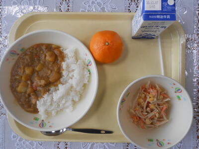【給食メニュー】ポークカレー、牛乳、ごぼうサラダ、みかんです。カレーは生徒の好物の一つで、甘味がありとても美味しかったです。ごちそうさまでした。