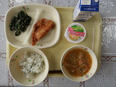 【給食メニュー】わかめご飯、牛乳、鶏肉の唐揚げ、ツナのり酢和え、坦々春雨スープ、シークワーサーゼリーです。毎日違った汁物が献立に出され、とても楽しみです。ごちそうさまでした。