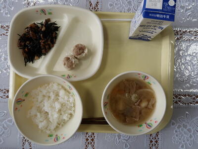 【給食メニュー】ご飯、牛乳、ポーク焼売、ひじきの炒り煮、豚汁です。肌寒い日には豚汁が最高です。ごちそうさまでした。