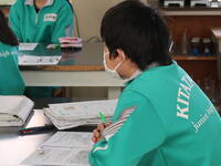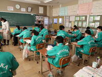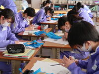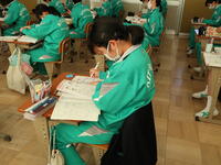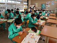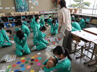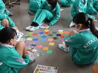 1年1組「美術」日本の伝統である「色カルタ」を行っていました。先生が「群青色(ぐんじょういろ)」と言ったらその色を取るというゲームで楽しそうに取り組んでいました。いろいろな色があるんですね。