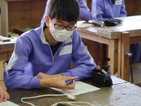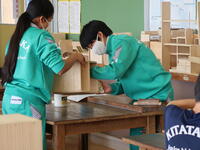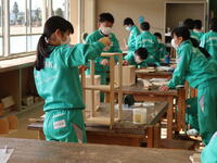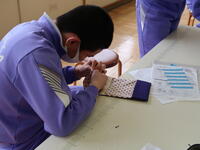 1年2組「技術」木材加工の仕上げです。間もなく完成です。