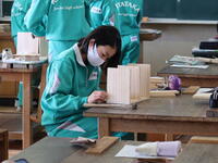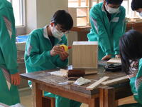 1年3組「技術」木材加工の仕上げに入りました。できあがった作品にロウワックスを塗っていました。何を入れるのでしょう。